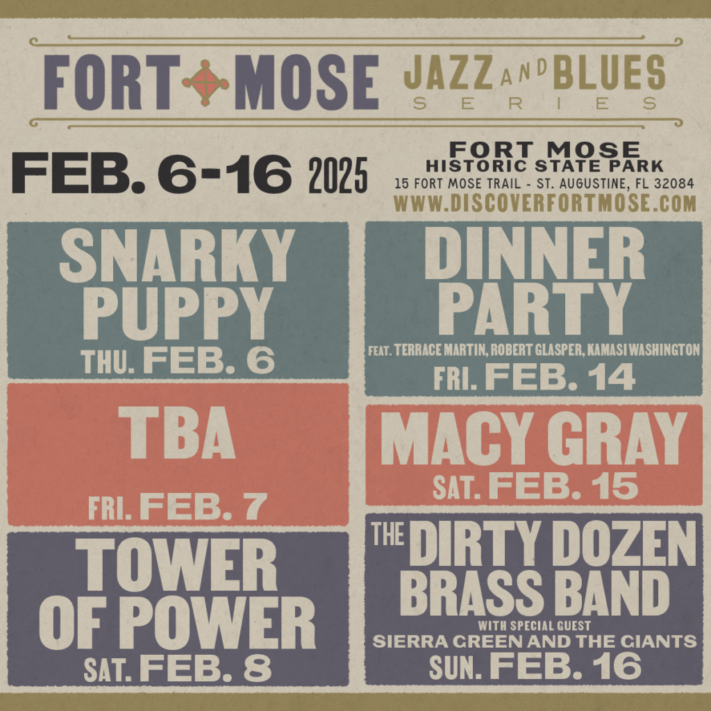 The 4th Annual Fort Mose Jazz and Blues Series which honors and celebrates the history and cultural significance of Fort Mose will take place February 6- 8 and 14-16 at Fort Mose Historic State Park. Featured performers include Snarky Puppy, Kem, Tower of Power, Dinner Party, Macy Gray, and The Dirty Dozen Brass Band with Sierra Green and The Giants.