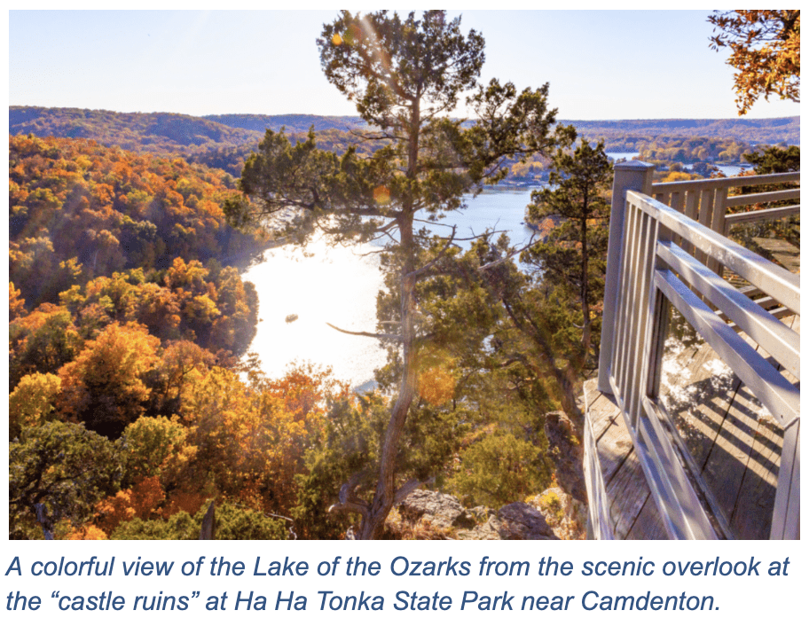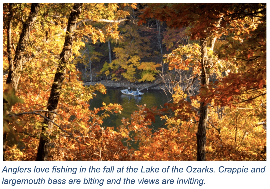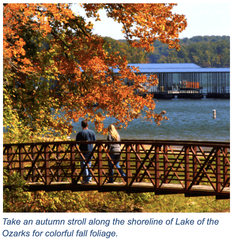 LAKE OF THE OZARKS, MO – There’s nothing like autumn in the Ozarks. The landscape around Central Missouri’s Lake of the Ozarks features many rolling hills, scenic overlooks and expansive views of the shimmering water. The picturesque setting is arguably at its finest when the surrounding hardwood forests turn vivid shades of orange, red and yellow each fall. For colorful fall foliage viewing, a trip to Lake of the Ozarks is an autumn essential.