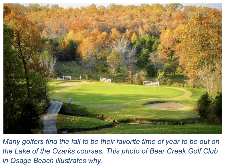 The peak of the fall colors at the Lake of the Ozarks typically occurs in mid- to late-October when the maples, ashes, oaks and hickories are at the height of their fall display. According to the Missouri Department of Conservation, the peak season varies from year to year depending on the weather and can last until early November.