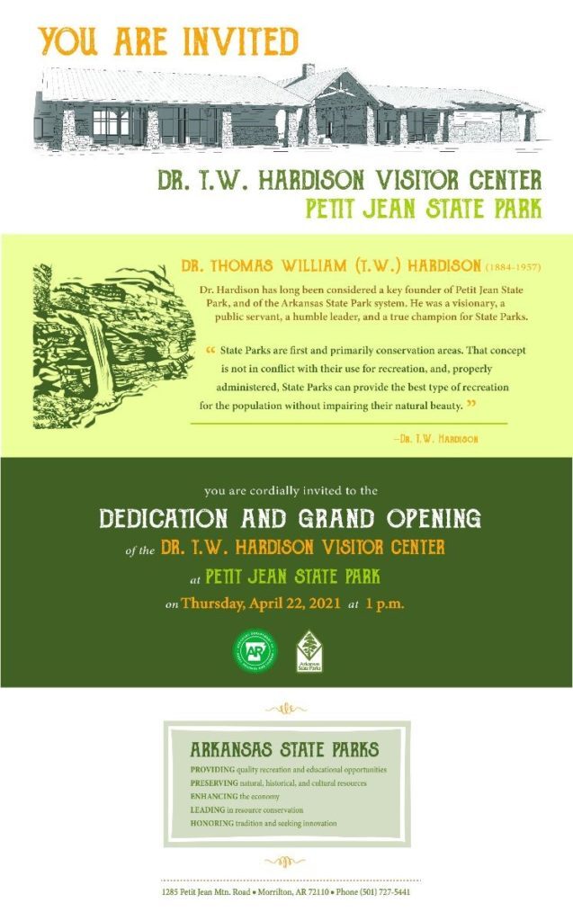 (MORRILTON, Ark.) – Gov. Asa Hutchinson will join in the dedication and grand opening of the Dr. T.W. Hardison Visitor Center at Petit Jean State Park. The newly constructed facility provides space for camper registration, interpretive exhibits, meetings, special events, and staff offices. It is named for the man whose vision for Petit Jean State Park brought about its creation as the cornerstone in the system of Arkansas State Parks.