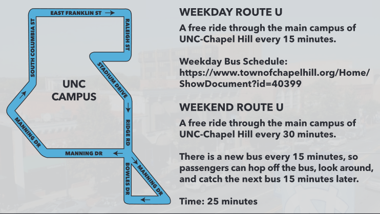 “I have a great idea,” he said. “I call it the Pauper’s Tour of Chapel Hill. It uses the fare free transit system to give visitors an easy and relaxing ride around town.” It is a great idea that involves hopping on the U route, which stops every 15 minutes, to see dozens of highlights on campus and downtown Chapel Hill. See this route here: https://www.orangecountync.gov/1710/Visitors-Bureau