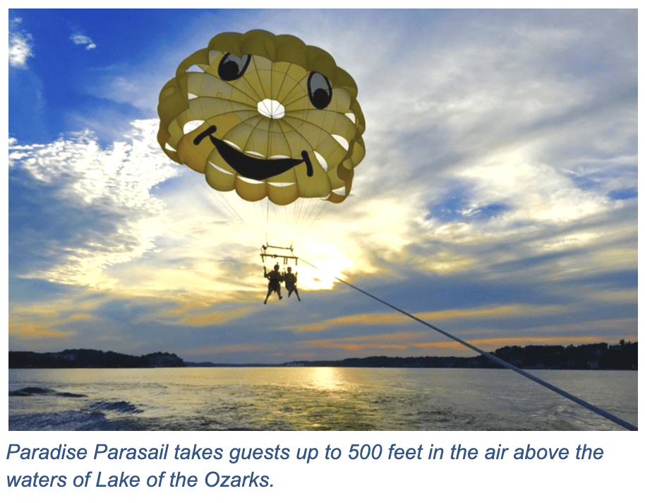 To catch even more air, Paradise Parasail, located next to the Bagnell Dam in Lake Ozark, takes customers above the water for a thrilling ride and unique view of the Lake of the Ozarks. Established at the Lake in 1983, Paradise Parasail harnesses adventure-takers into Paradise’s iconic smiley face chute as the wind naturally hoists riders aloft, sailing up to 500 feet above the Lake of the Ozarks. Parasail rides range from one half-mile up to three miles and run from $69 to $92 per person, depending which ride a visitor selects. To learn more about Paradise Parasail, visit www.ParadiseParasail.com.