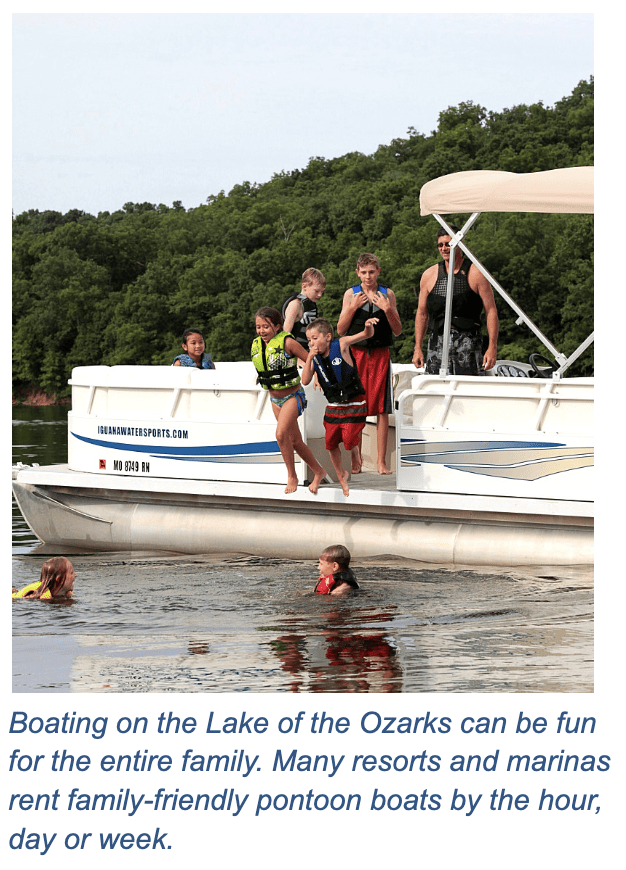 If visitors would like to spend their time exploring this fresh water “playground,” there are more than 50 marinas dotting the 1,150 miles of shoreline where adults can rent a boat by the hour, day or the week. The Lake of the Ozarks’ marinas as well as many of the resorts and campgrounds rent a variety of boats, including pontoons, speedboats, bass boats, personal watercraft, paddle boats, canoes and kayaks and stand-up paddleboards.