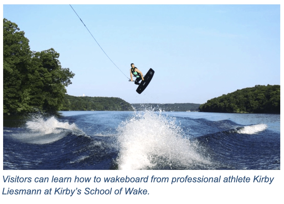 If a visitor is looking to make or ride some waves, then Kirby’s School of Wake offers everything needed to get started wakeboarding. The instructor at the School of Wake, located in Osage Beach, professional wakeboarder Kirby Liesmann, has studied with and shadowed some of the most accomplished professionals and coaches in the wakeboarding industry. Kirby puts his years of experience to use in helping others learn the sport. Since 2008, Kirby has taught hundreds of people how to safely pursue wakeboarding with one-on-one instruction through individual classes, day camps and group clinics during the summer months. Whether a wakeboarding student is just starting out and learning the basics or trying to nail some of the most thrilling advanced tricks, they’ll find Kirby’s relaxed, no-pressure teaching style fun and beneficial to them obtaining their goals and progressing at a speed they are comfortable with. For complete details on Kirby’s School of Wake, visit www.KirbysSchoolOfWake.com.