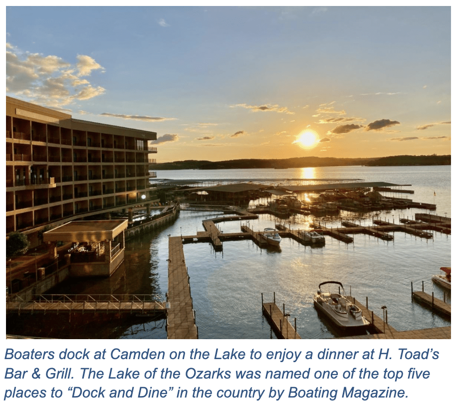 Named by Boating magazine as one of the top five destinations in the country to “Dock and Dine,” the Lake of the Ozarks features over 60 restaurants that are situated lakeside, either with a stunning view of the water or with convenient marinas where boaters can tie up their vessels, step off their boats and onto the dock and walk up to the restaurant to enjoy their meal.