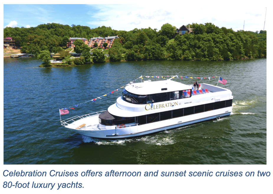 Vacationers that would prefer to leave the cruising to the captain can experience an easy and enjoyable boat ride on a leisurely Lake cruise. Celebration Cruises, based near the Bagnell Dam in Lake Ozark, offers two 80-foot luxury yachts that cruise every day, with the exception of Mondays. Celebration offers 90-minute narrated noon tours with an optional lunch and 90-minute sunset cruises with dinner optional. Boarding for the noon cruise begins at 12:00 p.m. with a 12:30 p.m. departure. Boarding for the sunset cruise begins at 5:30 p.m. and departs at 6:00 p.m. Tickets for both cruises begin at $35 for adults and $20 for children from 2-10 years of age, though prices will vary depending on menu selections. For more information, or to book a cruise with Celebration, call 573-480-3212 or visit www.CruiseLakeOfTheOzarks.com.