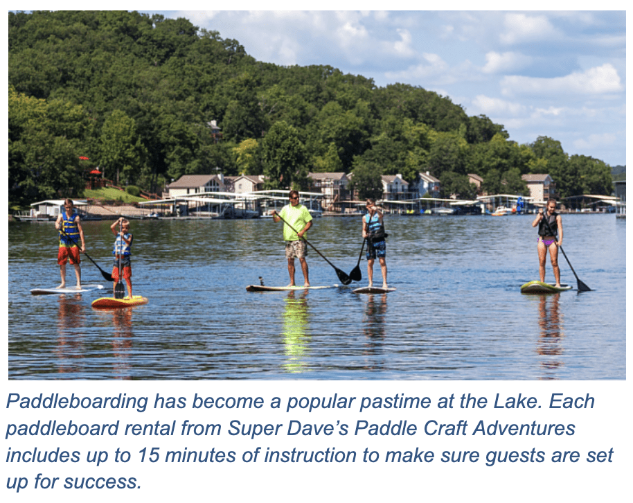 For those wanting to learn how to paddleboard, the Lake of the Ozarks is a great place to start. There are a handful of businesses that not only rent paddleboards but also provide lessons for those new to the sport. Super Dave’s Paddle Craft Adventures in Sunrise Beach, Paradise Marina and Watersports in Lake Ozark, Sunset Beach Resort’s Adventure Boat Rentals in Camdenton and Wake Effects in Osage Beach all make sure to set every guest up for success. Each paddleboard rental comes with personalized instructions for those that need it on how to safely and successfully get on the board, stand up on the board, how to paddle efficiently and how to control the board before vacationers make their way out into the quiet coves to enjoy their newly acquired skill. Lessons can take anywhere from five to 15 minutes depending upon the customer, and, extra assistance and coaching are provided if necessary.