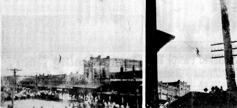The high-wire performers, Antigravity Art, are recreating a historic moment from 1914, when Will Taylor, known as “Bill the Movie Man,” staged a high-wire walk across Main Street. The local theatre owner promoted the stunt in the Grapevine Sun newspaper with bold, Hollywood-style flair, promising that during Trades Day on Saturday, May 9, 1914, he would walk, crawl or even swim across a tight wire from one of the destination’s tallest buildings. The spectacle was designed to draw attention to his business, Taylor’s Theatre. The following week, the Sun’s editor confirmed the feat was a success, and they later published a grainy photograph that offered a faint glimpse into the moment.