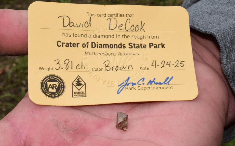 MURFREESBORO, Ark. – David DeCook, a regular visitor to Arkansas’ Crater of Diamonds State Park from Stewartville, MN, recently spotted a glimmering 3.81-carat brown diamond while visiting the park with his family. It is the largest diamond registered so far this year.